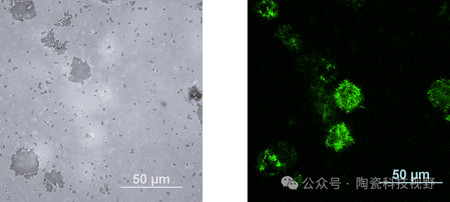 使用激光熒光顯微鏡觀察到的與左圖相同區(qū)域的熒光圖像,位于表面以下約3 µm(右)