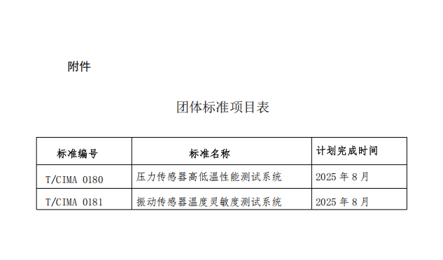 根據(jù)《中國儀器儀表行業(yè)協(xié)會團體標(biāo)準(zhǔn)管理辦法》的規(guī)定,經(jīng)審查,對由中國航空工業(yè)集團公司北京長城計量測試技術(shù)研究所(簡稱“304所”)提出的《壓力傳感器高低溫性能測試系統(tǒng)》 《振動傳感器高低溫性能測試系統(tǒng)》2項團體標(biāo)準(zhǔn)進行立項(標(biāo)準(zhǔn)編號和標(biāo)準(zhǔn)名稱見公告附件),特此公告。