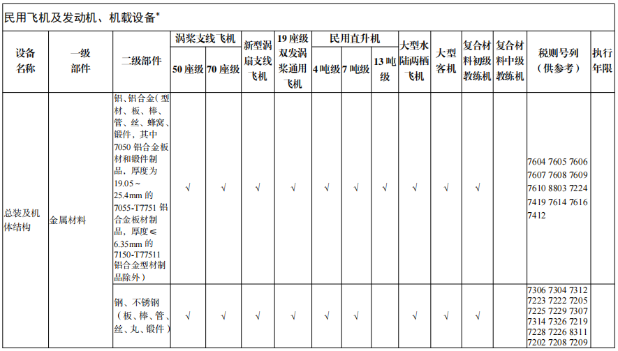(1)鋁、鋁合金(型材、板、棒、管、絲、蜂窩、鍛件,其中7050 鋁合金板材和鍛件制品,厚度為19.05~25.4mm 的7055-T7751 鋁合金板材制品,厚度≤6.35mm 的7150-T77511鋁合金型材制品除外)