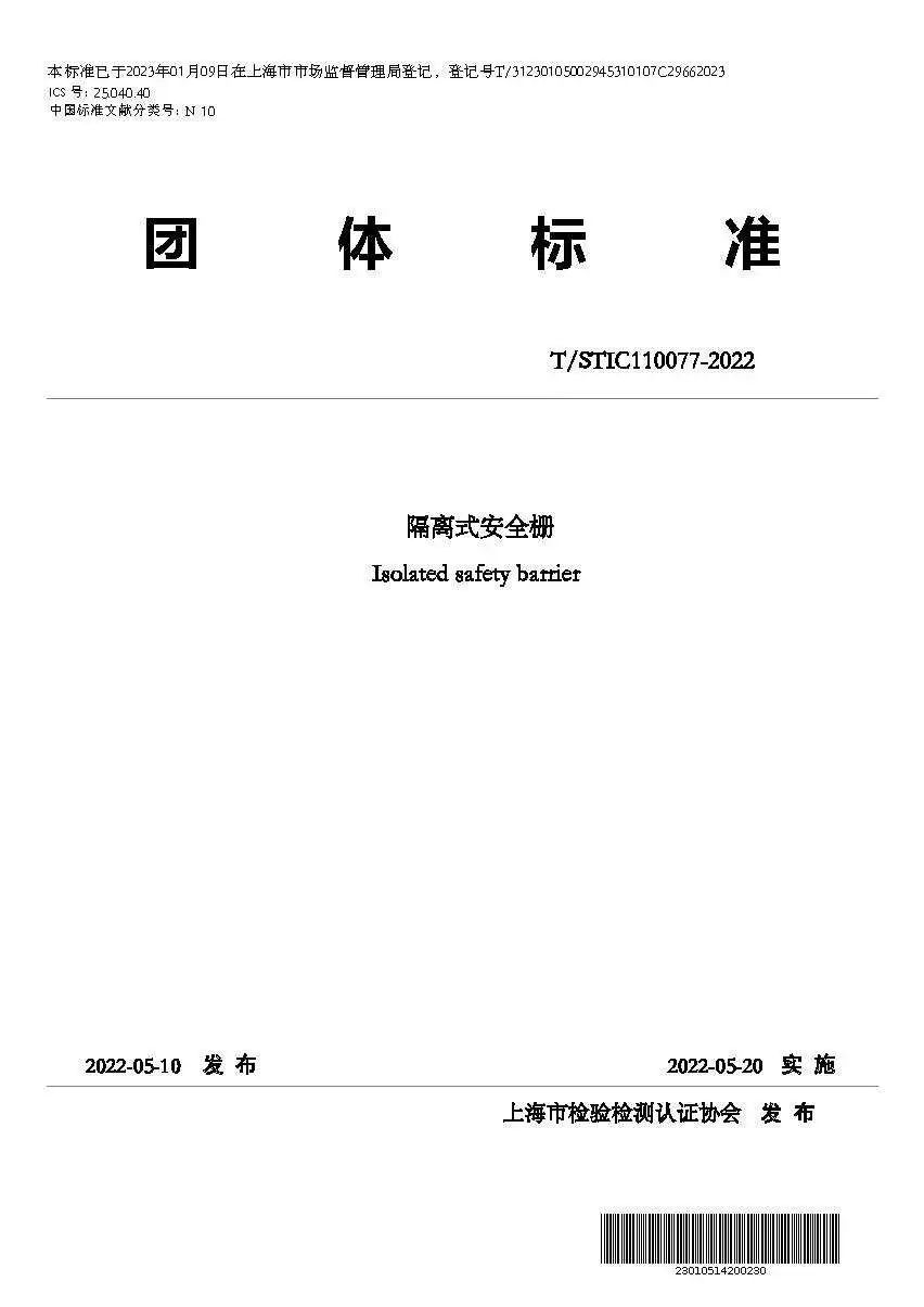 T/STIC 110077—2022《隔離式安全柵》標(biāo)準(zhǔn)規(guī)定了隔離式安全柵的分類、技術(shù)要求、試驗(yàn)方法、 檢驗(yàn)規(guī)則與合格判定,以及標(biāo)志、包裝及貯存,適用于包括模擬信號(hào)、溫度信號(hào)和數(shù)字信號(hào)任何具有特定的輸入、輸出變量,且輸入輸出變量之間具有特定關(guān)系(傳遞函數(shù))的信號(hào)隔離和限能功能的隔離式安全柵。