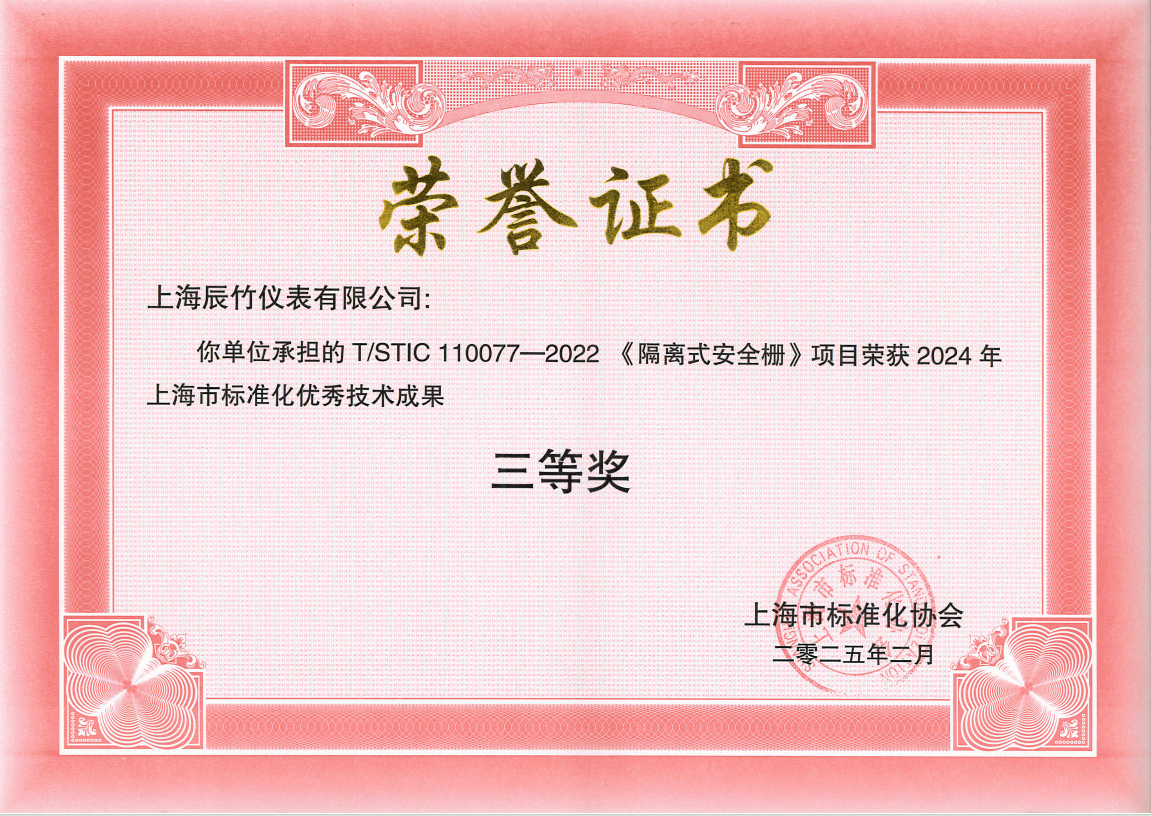 辰竹主導(dǎo)制定的 T/STIC 110077—2022《隔離式安全柵》團(tuán)體標(biāo)準(zhǔn)榮獲2024年上海市標(biāo)準(zhǔn)化優(yōu)秀技術(shù)成果三等獎(jiǎng)。2025年2月26日,以“標(biāo)準(zhǔn)引領(lǐng)未來(lái),協(xié)作共促發(fā)展,不斷開創(chuàng)上海市標(biāo)準(zhǔn)化建設(shè)新局面”為主題的上海市標(biāo)準(zhǔn)化協(xié)會(huì)十屆三次會(huì)員代表大會(huì)召開,并對(duì)2024年上海市標(biāo)準(zhǔn)化優(yōu)秀成果進(jìn)行表彰。