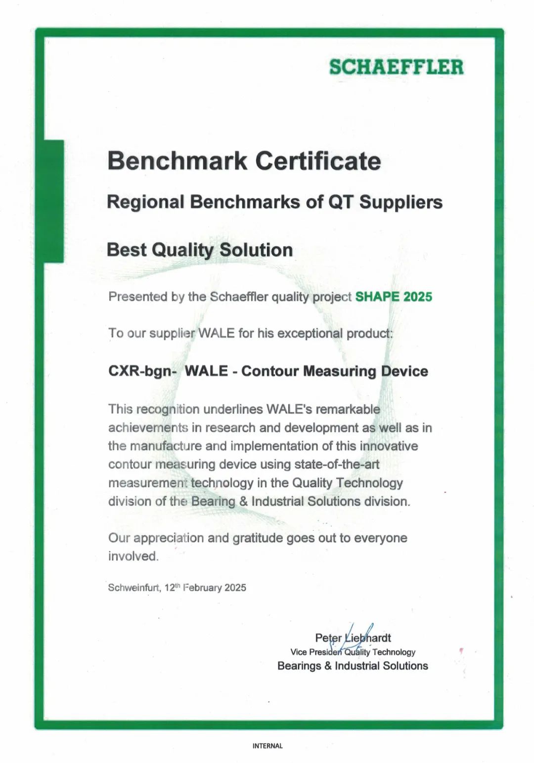 舍弗勒(Schaeffler)作為全球生產(chǎn)滾動(dòng)軸承和直線運(yùn)動(dòng)產(chǎn)品的領(lǐng)導(dǎo)企業(yè),不僅對(duì)產(chǎn)品質(zhì)量有著嚴(yán)格的要求,對(duì)于合作供應(yīng)商亦有嚴(yán)苛的考核標(biāo)準(zhǔn)。此次威爾輪廓儀榮獲舍弗勒(Schaeffler)B&IS質(zhì)量技術(shù)認(rèn)證,是舍弗勒(Schaeffler)對(duì)威爾實(shí)力的充分肯定,也是對(duì)威爾推動(dòng)企業(yè)降低經(jīng)營成本、加強(qiáng)質(zhì)量控制的高度認(rèn)可。Mr.Liebhardt(舍弗勒B&IS質(zhì)量技術(shù)副總裁)高度評(píng)價(jià):“威爾在軸承測(cè)量領(lǐng)域的深耕與創(chuàng)新,不僅展現(xiàn)了本土企業(yè)的技術(shù)韌性,更通過高效解決方案與全球化服務(wù)能力,為舍弗勒(Schaeffler)的質(zhì)量數(shù)字化戰(zhàn)略及推動(dòng)運(yùn)營成本的降低注入了強(qiáng)勁動(dòng)能。”。Mr.Marco Ma(舍弗勒計(jì)量檢測(cè)專家)強(qiáng)調(diào):“威爾輪廓儀的精準(zhǔn)度與可靠性,為我們的精密零部件生產(chǎn)提供了堅(jiān)實(shí)保障。”