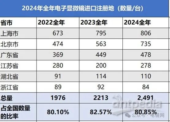 近三年來,上海市、北京市、廣東省、江蘇省、湖北省和浙江省是主要的電子顯微鏡進口地區。上海市進口量最多,2024年進口806臺;北京市和廣東省穩定增長,江蘇省呈現先增后降趨勢。整體顯示了不同地區的市場需求和發展趨勢。