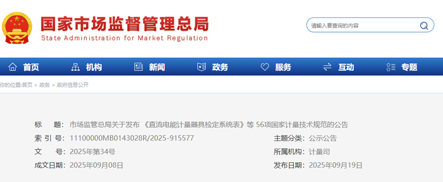 市場(chǎng)監(jiān)管總局關(guān)于發(fā)布《直流電能計(jì)量器具檢定系統(tǒng)表》等56項(xiàng)國(guó)家計(jì)量技術(shù)規(guī)范的公告