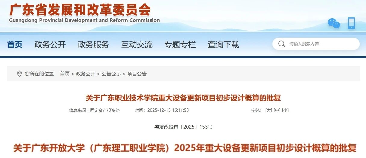 12月15日,廣東省發(fā)展和改革委員會(huì)連續(xù)發(fā)布兩項(xiàng)批復(fù)——“關(guān)于廣東職業(yè)技術(shù)學(xué)院重大設(shè)備更新項(xiàng)目初步設(shè)計(jì)概算的批復(fù)”以及“關(guān)于廣東開放大學(xué)(廣東理工職業(yè)學(xué)院)2025年重大設(shè)備更新項(xiàng)目初步設(shè)計(jì)概算的批復(fù)”。根據(jù)批復(fù),兩所院校擬更新購置共142臺(套)教學(xué)科研儀器設(shè)備,總投資14930萬元。