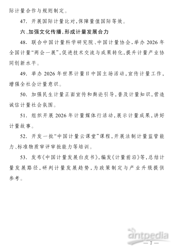 2026年,全國計量工作主要圍繞六個方面開展:聚焦規(guī)劃落實,完善計量頂層設(shè)計;加強基礎(chǔ)建設(shè),提升計量保障能力;創(chuàng)新監(jiān)管模式,守牢計量公正底線;圍繞戰(zhàn)略需求,優(yōu)化計量服務支撐;深化國際合作,推動計量高水平對外開放;加強文化傳播,形成計量發(fā)展合力。具體包括推進計量法修訂,圍繞新技術(shù)、新產(chǎn)業(yè)、新業(yè)態(tài)建設(shè)一批計量技術(shù)委員會等內(nèi)容。