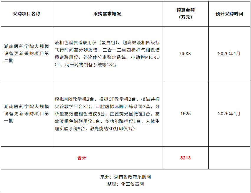 近日,湖南醫藥學院公布2026年2季度采購意向,計劃采購液相色譜質譜聯用儀、外泌體分離鑒定系統、核磁共振實驗教學平臺、分析型高效液相色譜儀、正置熒光顯微鏡、多功能酶標儀等47臺儀器設備,預算總金額8213萬元。預計采購時間2026年4月。