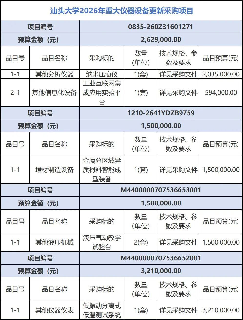 近日,汕頭大學2026年重大儀器設備更新采購項目正式對外公布。該項目共發布6個公開招標文件,總預算金額超過1400萬元。