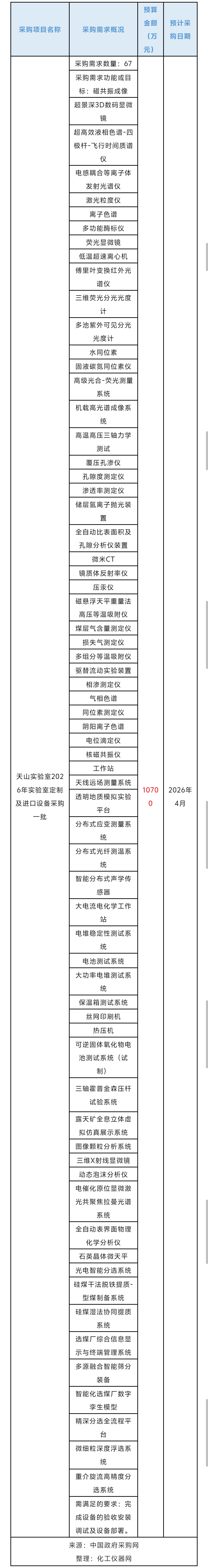近日,天山實驗室發(fā)布一批實驗室設(shè)備采購意向,計劃采購超高效液相色譜-四極桿-飛行時間質(zhì)譜儀、電感耦合等離子體發(fā)射光譜儀、激光粒度儀、離子色譜、多功能酶標儀等設(shè)備,預(yù)算總金額1.07億元。預(yù)計采購時間2026年4月。