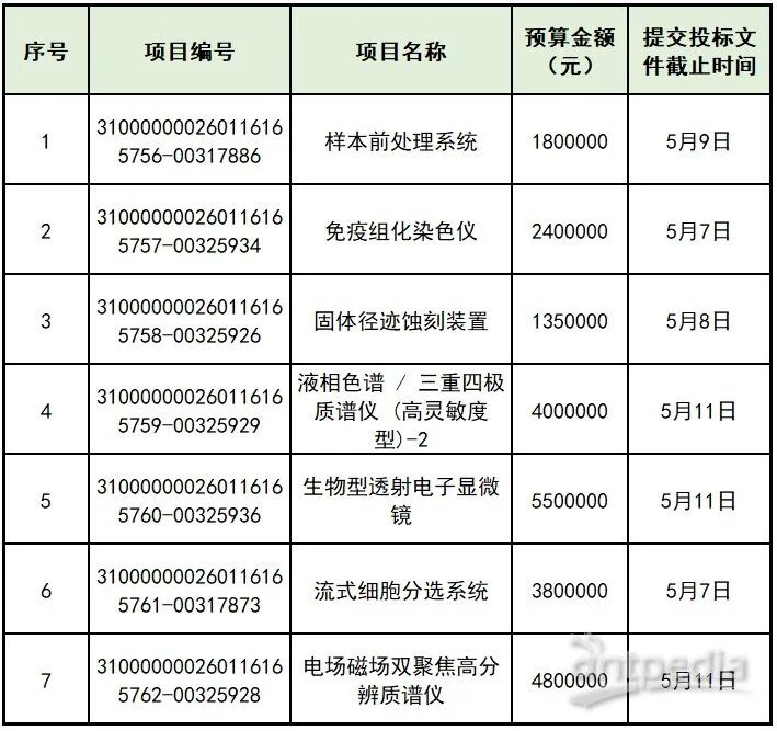 近日,上海市疾病預(yù)防控制中心(上海市預(yù)防醫(yī)學(xué)科學(xué)院)發(fā)布多批招標(biāo)公告,就液相色譜/三重四極質(zhì)譜儀、生物型透射電子顯微鏡、流式細(xì)胞分選系統(tǒng)等多批檢測設(shè)備進行采購,本次招標(biāo)預(yù)算總額達2365萬元。